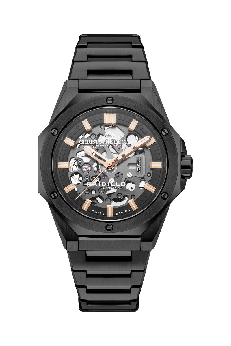Montre automatique en acier Raidillon Skeleton II - Noir et doré rose