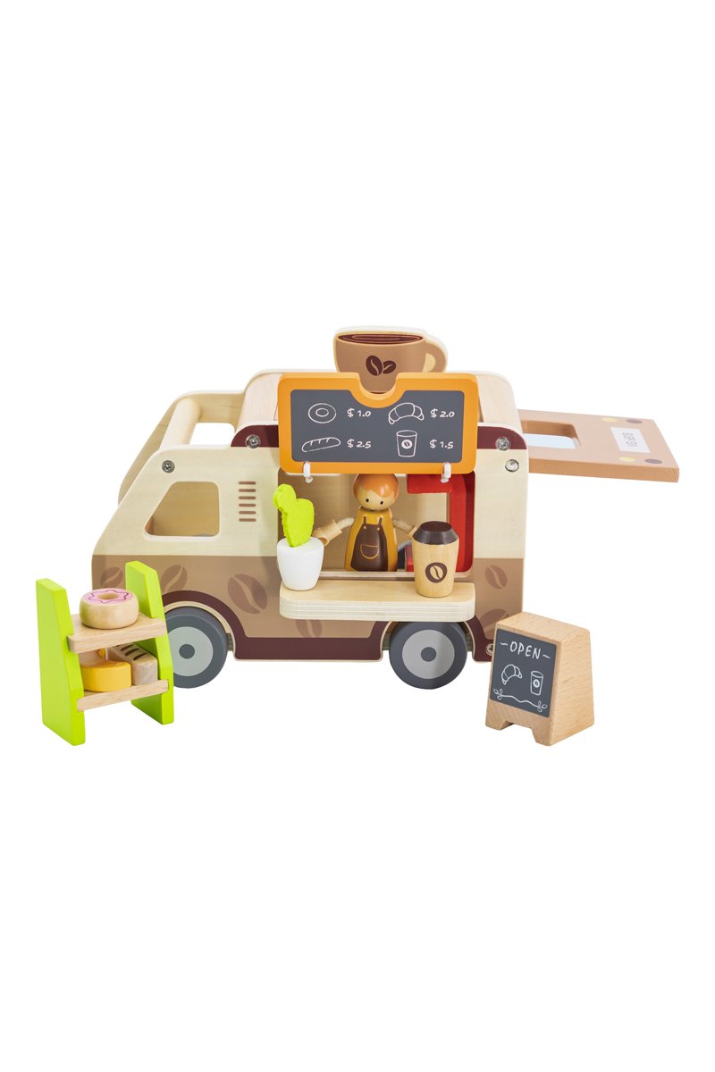 Comprend un barista, un présentoir à pâtisseries, un donut, un croissant, du pain, un café, une plante décorative, une enseigne pour le café, une machine à café avec table et une ardoise.