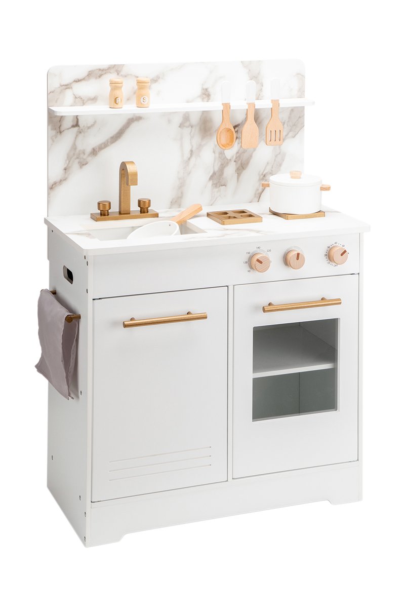 Conçu pour imiter une vraie cuisine, cet ensemble de jeu présente un design élégant et moderne avec un comptoir et un plan de travail d’aspect marbre.