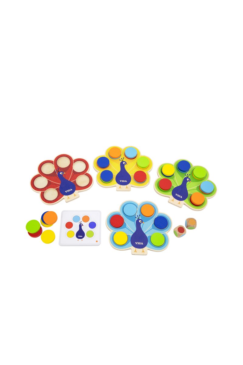Jeu d'association de couleurs du paon en bois.