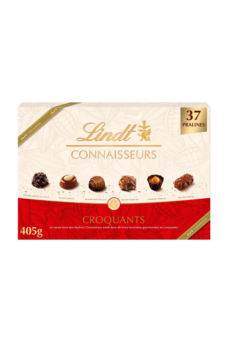 Lindt Connaisseurs Croquants est un assortiment de fines bouchées de chocolat aux textures délicieusement croquantes, créé par les Maîtres Chocolatiers Lindt dans le respect de la tradition chocolatière. À travers leur savoir-faire, découvrez 37 fines bouchées célébrant le croquant sous toutes ses formes : 4 bouchées Rocher Noisettes, 4 bouchées Rocher Noir Éclat Cacao, 5 bouchées Rocher Caramel, 6 bouchées Gianduja Noisette, 8 bouchées Praliné Croustillant, 10 bouchées Douce Amande.