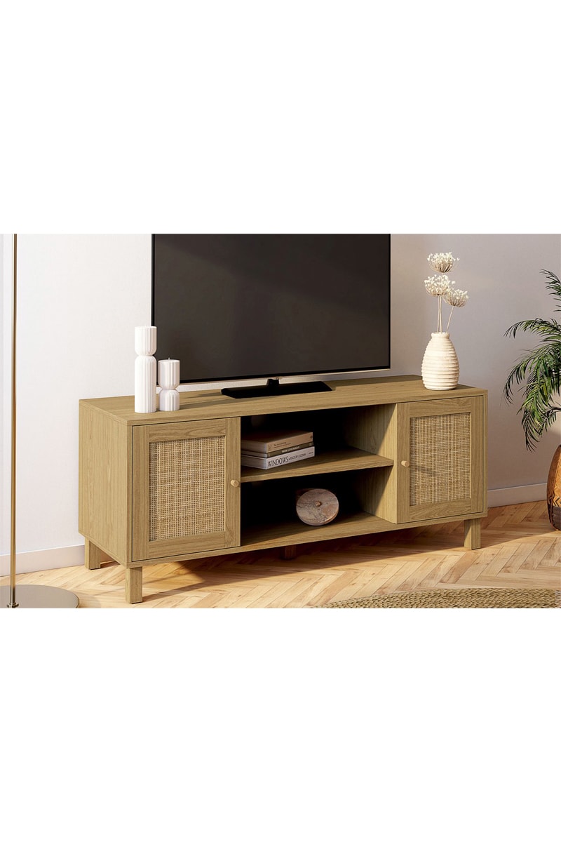 Meuble TV 2 portes Erin - Pieds en pin - Façades en rotin - 115 x 40 x 48 cm