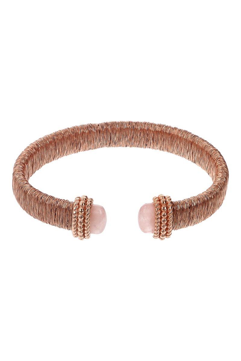 Jonc ouvert en argent plaqué or rose serti de 2 quartz.