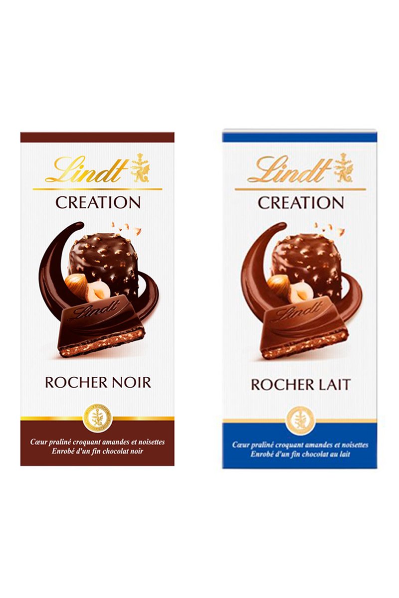 Succombez à Lindt Création Le Rocher Noir : un praliné amandes et noisettes fondant allié aux croustillants éclats de noisettes caramélisés, au cœur du fin chocolat noir Lindt.