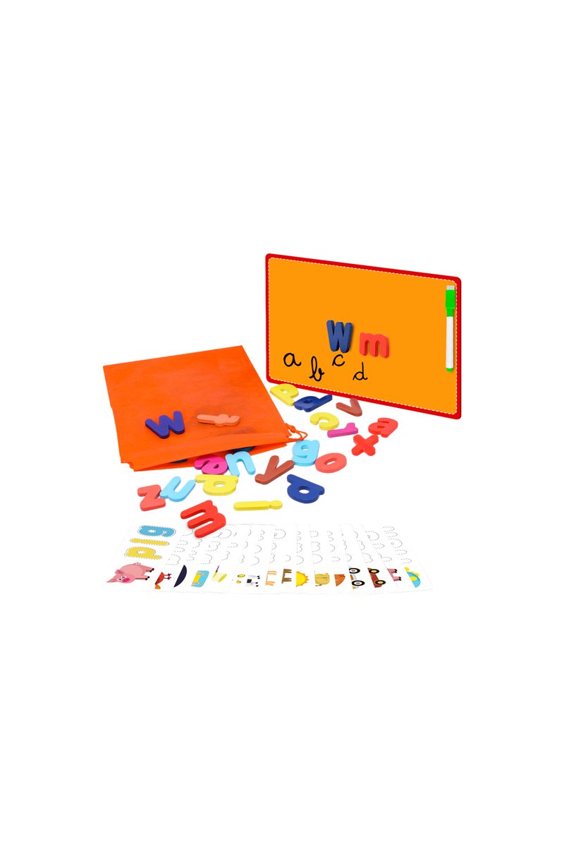 Avec des lettres en bois et des jetons d'animaux.