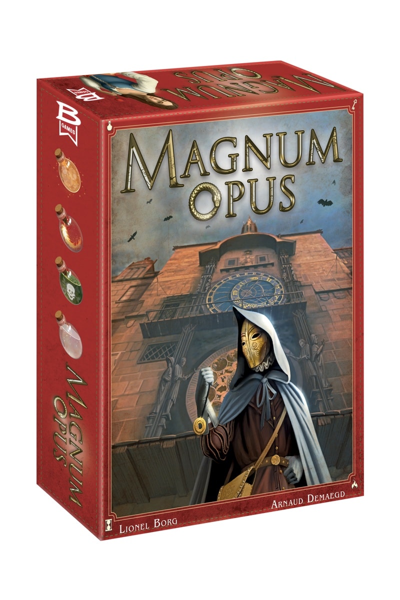 Règles du jeu : chaque joueur incarne un alchimiste venu à prague pour réunir les composants alchimiques nécessaires à la réalisation d’une ou deux formules destinées à son magnum opus, chaque composant acquis, chaque formule complétée et chaque paire de composants en vue rapportent des points de prestige, le joueur en ayant le plus au terme de la partie est déclaré vainqueur.