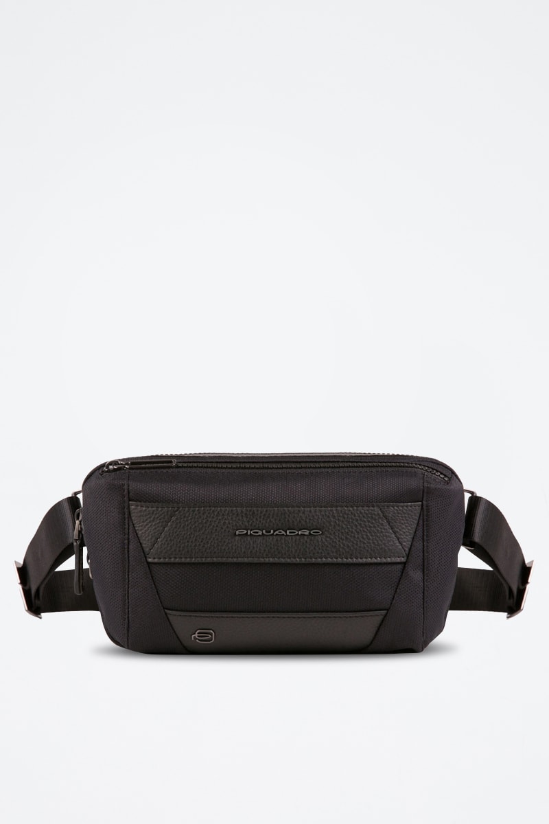 Poche zippée, empiècement en cuir grainé et logo métallique devant.