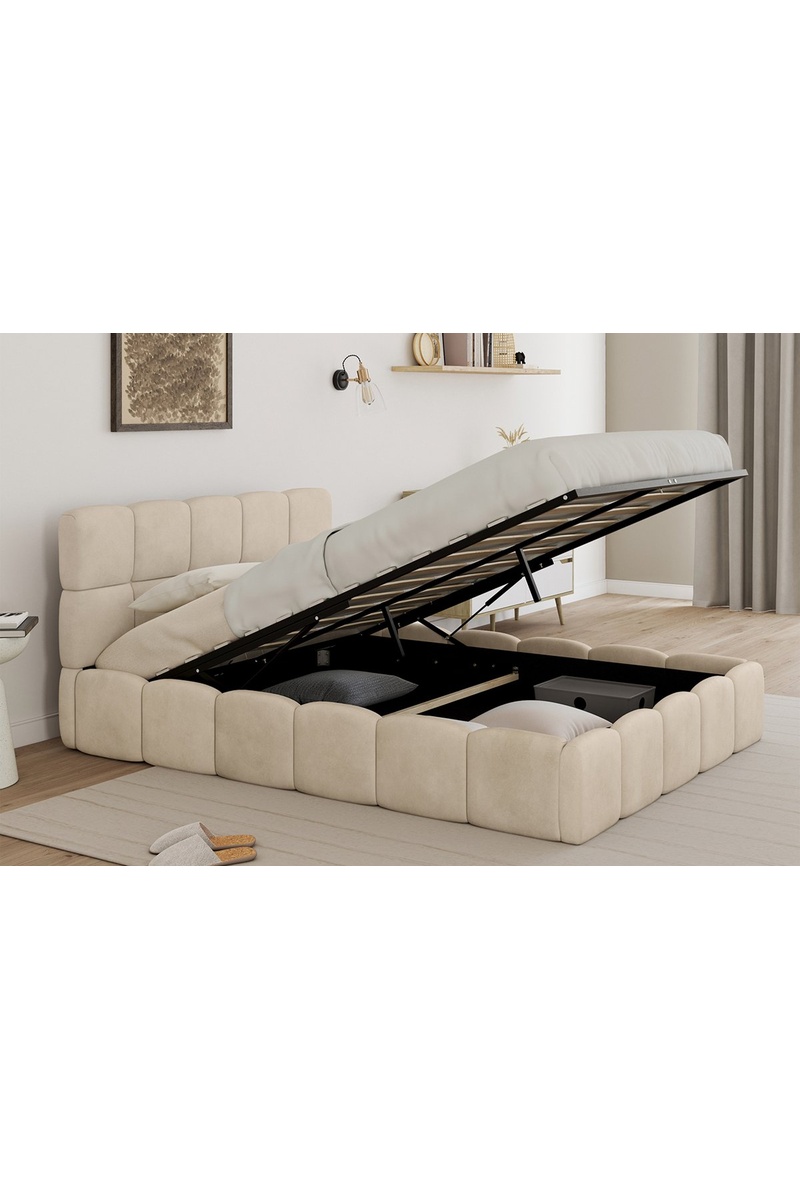 Lit coffre Bubble en velours beige avec sommier et tête de lit 140x190cm