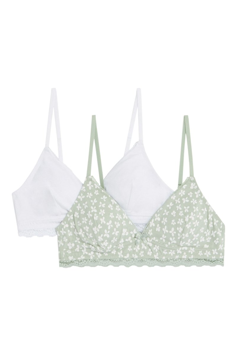 2 soutiens-gorges push-up sans armatures en coton biologique dont 1 à motifs fleuris.