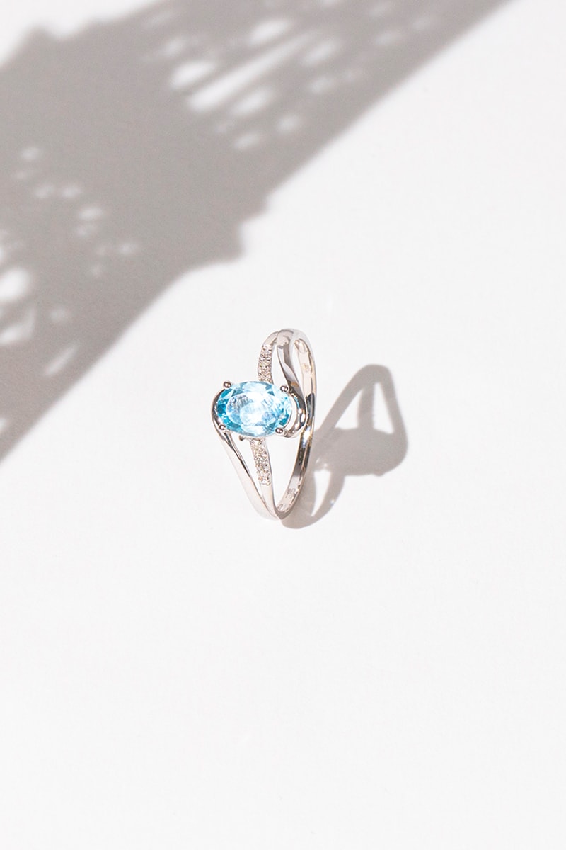 Matière : or blanc 375/1000, diamants 0,03 carat/6 et topaze 1,7 carat/1