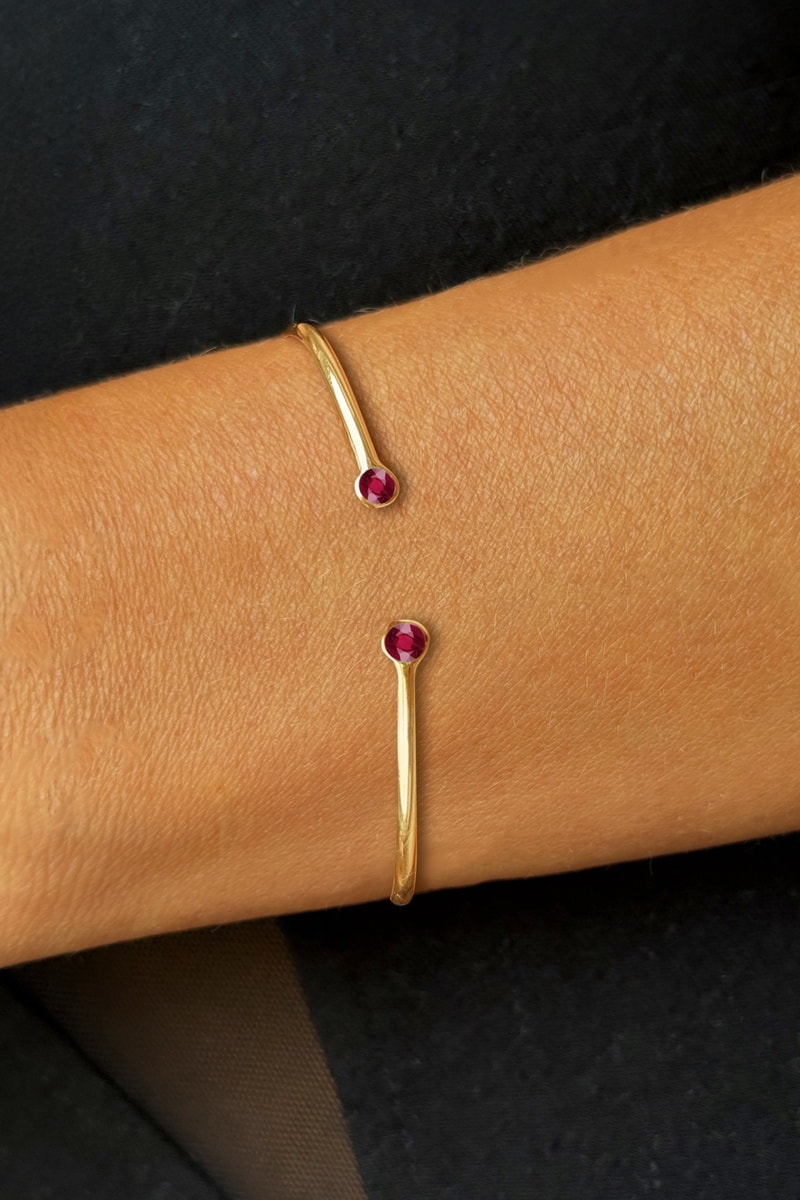 Jonc ouvert en argent plaqué or jaune serti de 2 rubis.