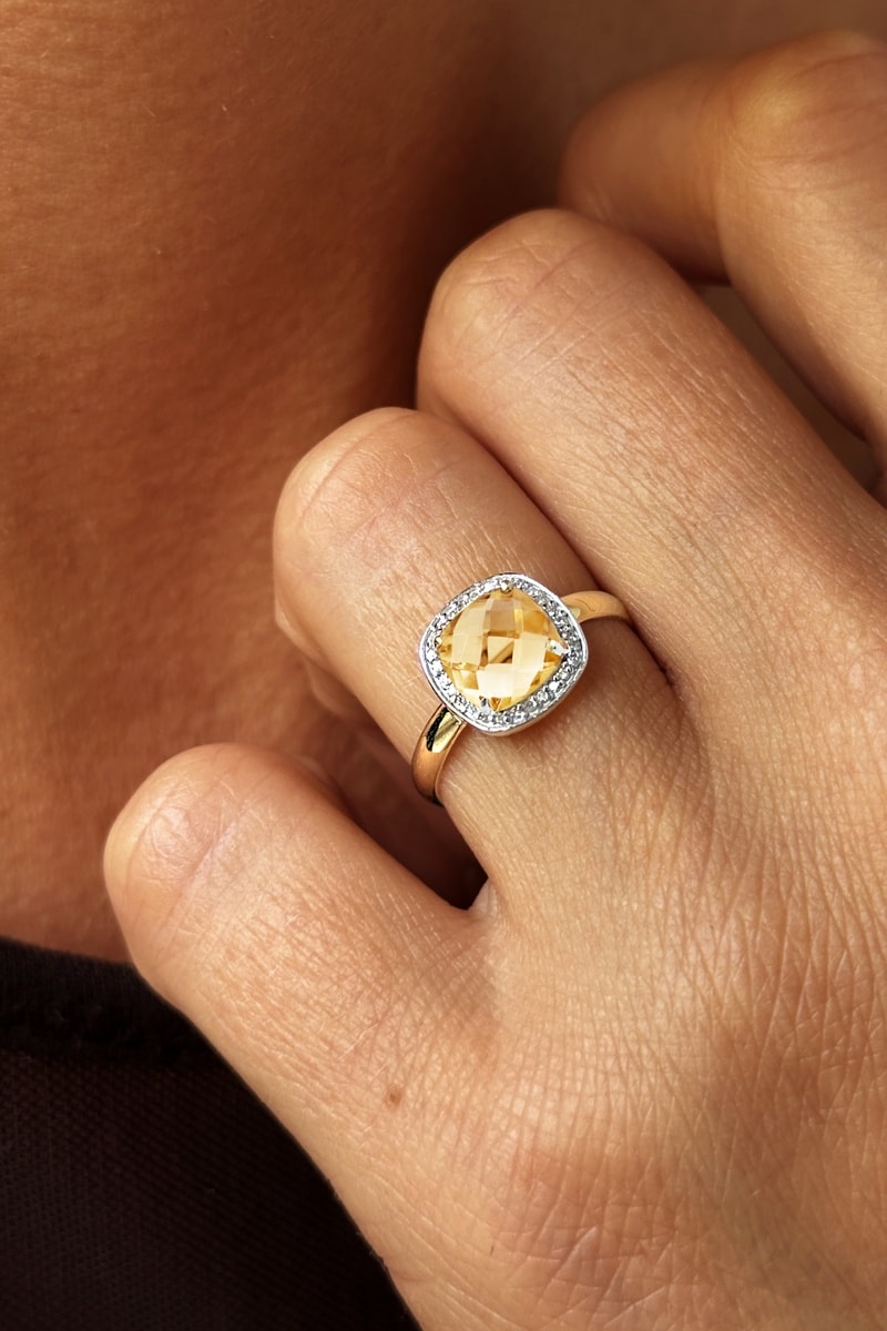 Bague - Argent plaqué or jaune, argent, diamants et citrine