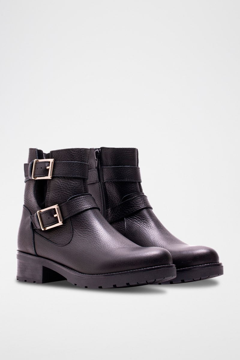 Fermeture zippée sur le côté intérieur et par brides à boucles sur le côté extérieur.
