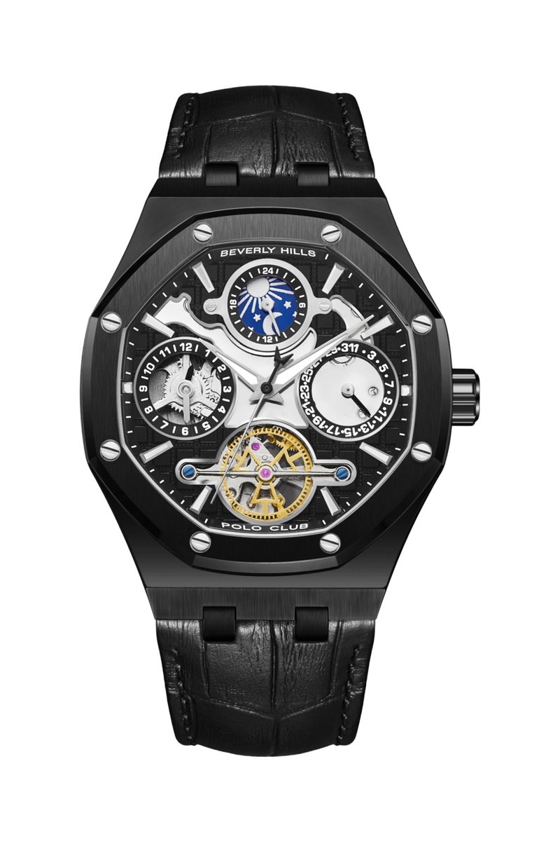 Montre automatique en cuir - Compteur phases de la lune - Noir et atgenté