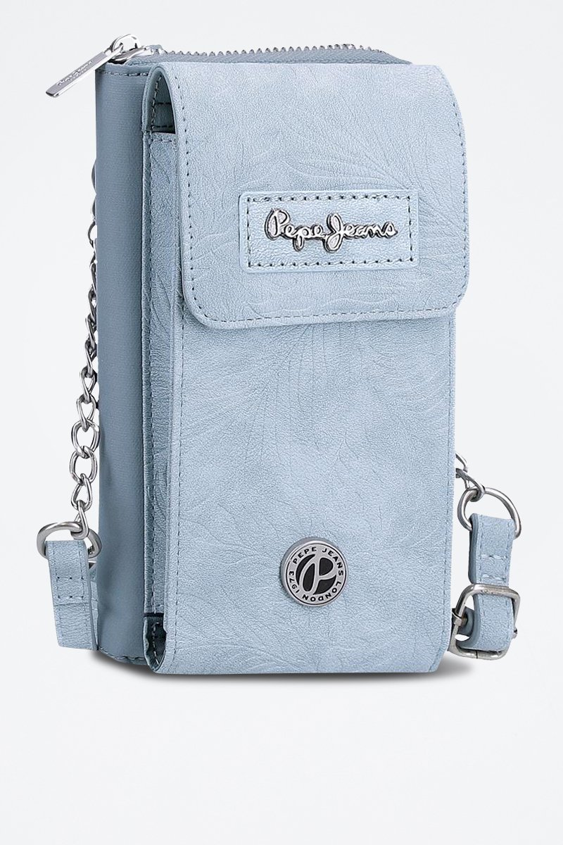 Poche à rabat pressionné pour téléphone, effet cuir, motifs fleuris en relief et logo métallique devant.