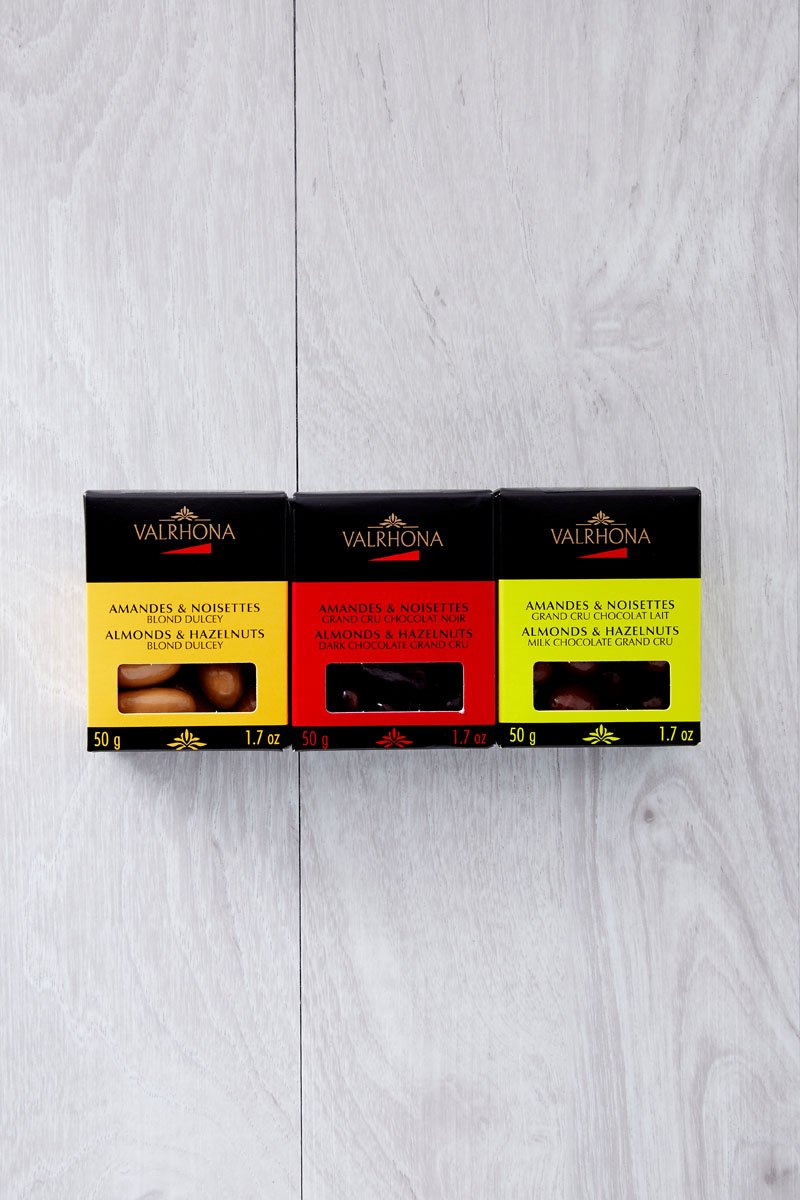 Coffret amandes et noisettes au chocolat blond, noir et lait - 3 x 50 g
