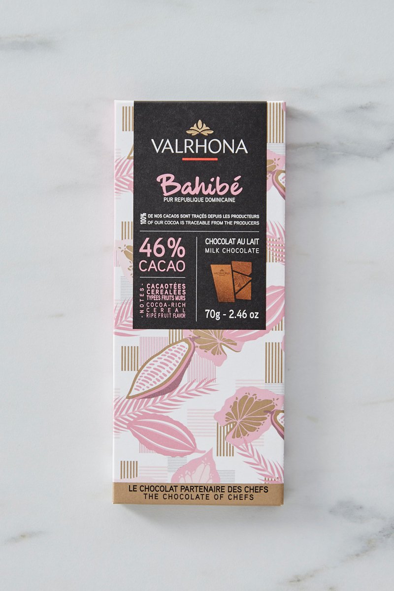 Avec son pourcentage de cacao étonnamment élevé pour un chocolat au lait (46%), Bahibe est le plus cacaoté des chocolats au lait Valrhona. Le nom Bahibe est un hommage à la « Rose de Bayahibe », fleur de cactus emblème de la République Dominicaine.