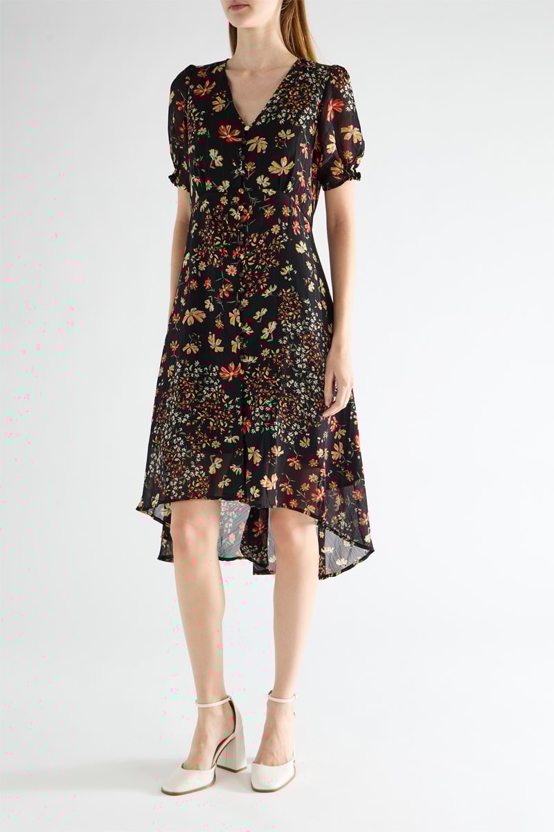 Robe trapèze à manches courtes bouffantes.