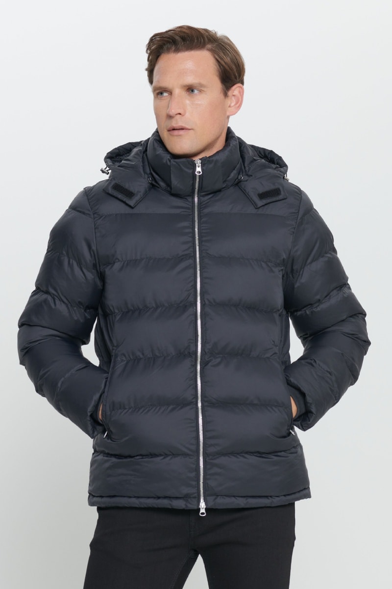 Doudoune à capuche amovible avec liens de serrage et barillets.