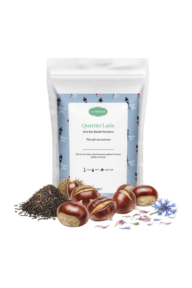 Ingrédients : thé noir de chine, arôme (marron), pétales de mauve, pétales de bleuet.