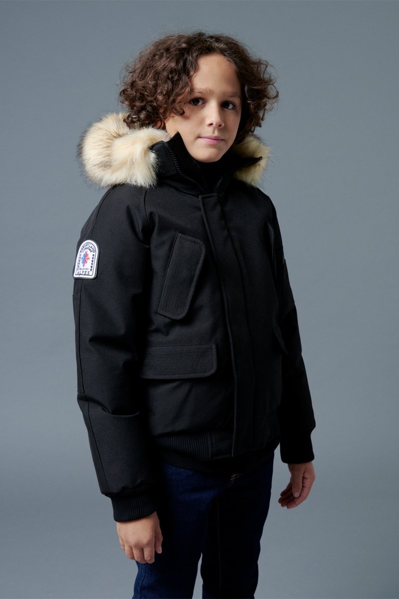 Capuche avec fourrure synthétique amovible et liens de serrage.