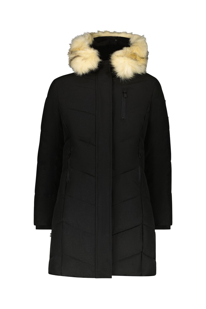 Doudoune à capuche en fourrure synthétique.