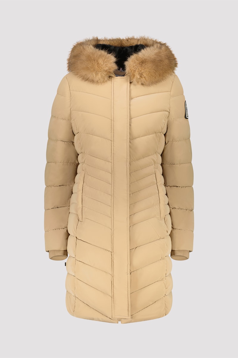 Capuche fixe fourée et bordée d'une fourrure synthétique amovible.