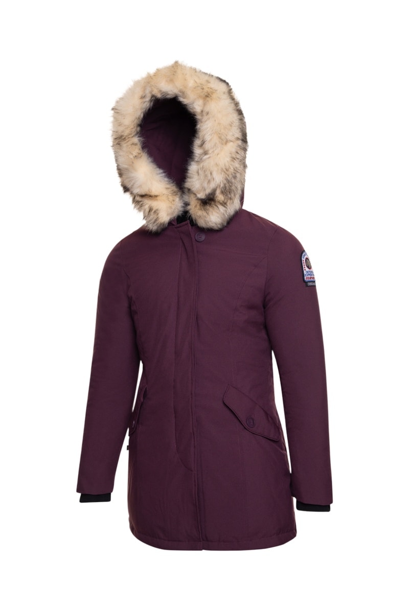 Capuche fixe fourrée et bordée de fourrure synthétique amovible.