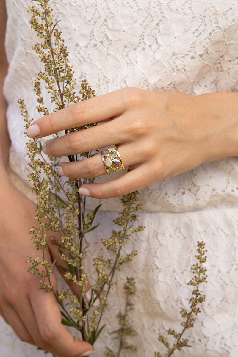 Bague sertie de quartz, d'aqua calci et d'une labradorite.