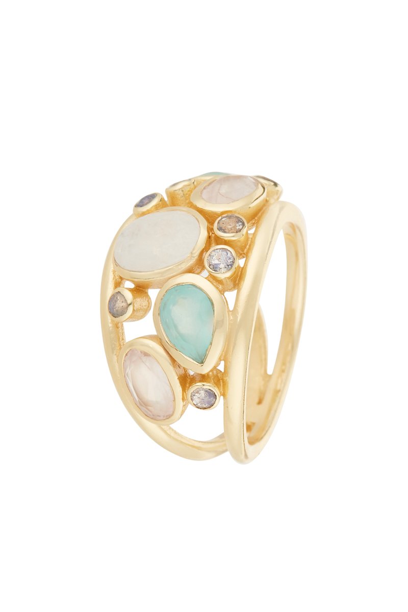 Bague sertie d'aqua calci, de quartz, de rainbow et de labradorites.