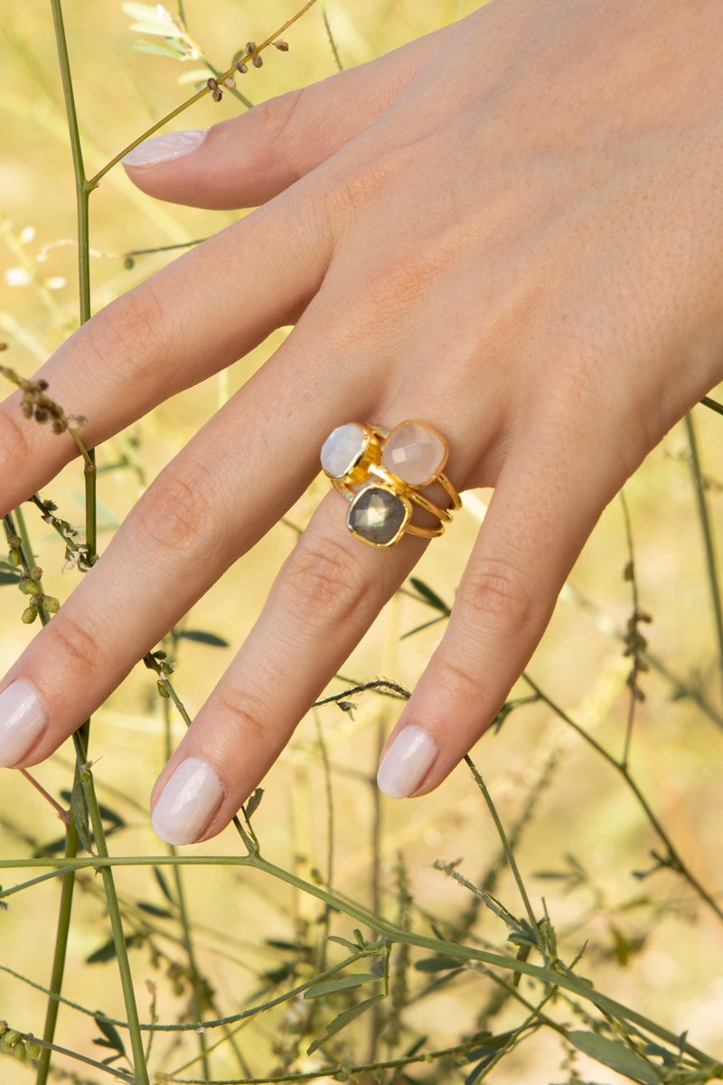 Bague sertie d'un quartz, d'une labradorite et d'une pierre de lune.