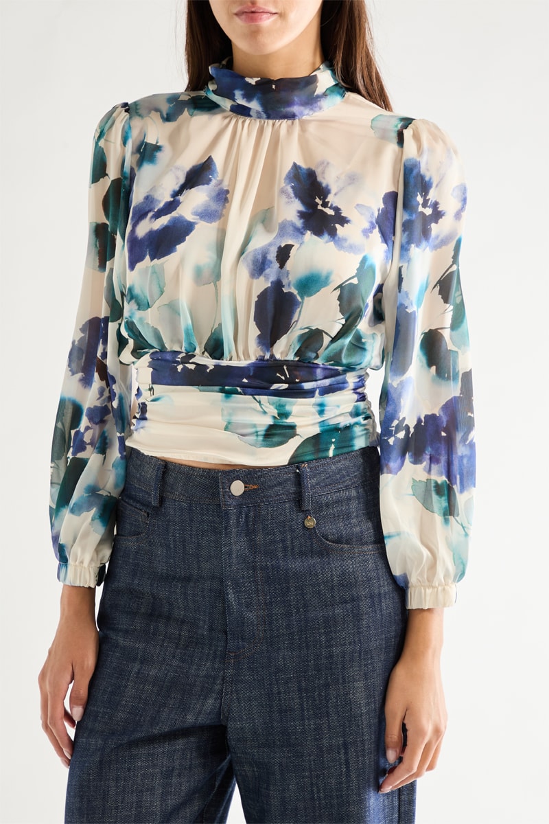 Blouse à manches longues bouffantes élastiques.