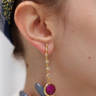 Craquez pour ces boucles d'oreilles en laiton plaqué or, sublimées par des rubis peints aux couleurs éclatantes. Élégantes et légères, elles apporteront une touche de glamour et de sophistication à toutes vos tenues !