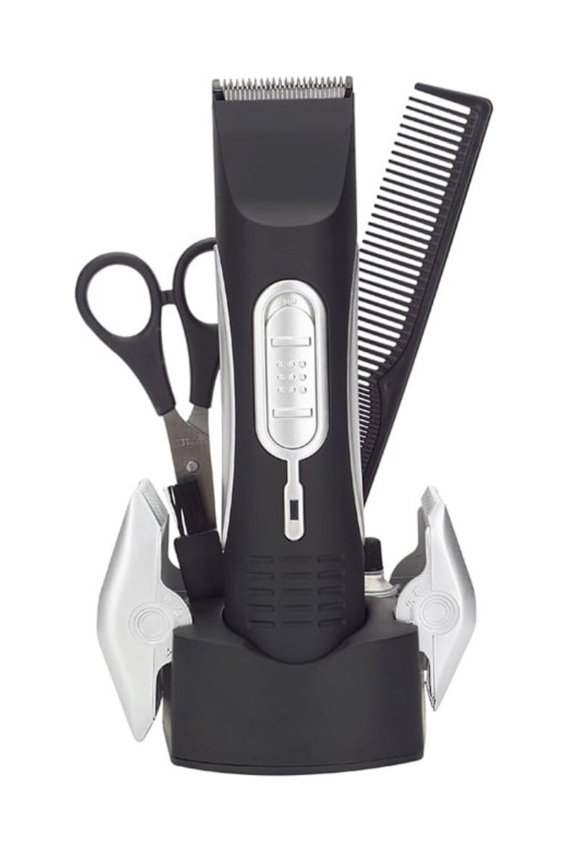 Livrée avec adaptateur de secteur, ciseaux, peigne de coiffeur, brossette de nettoyage et huile.