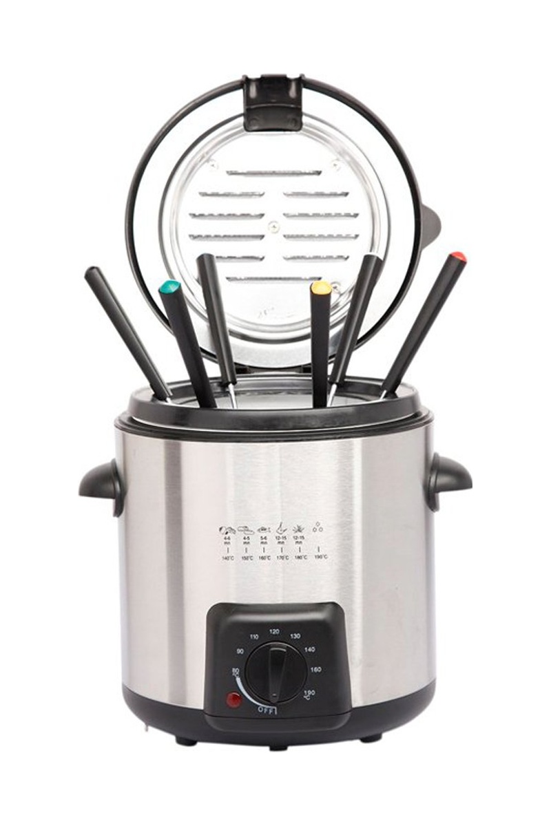 6 pics à fondue et panier à friture-poignée détachable fournis.