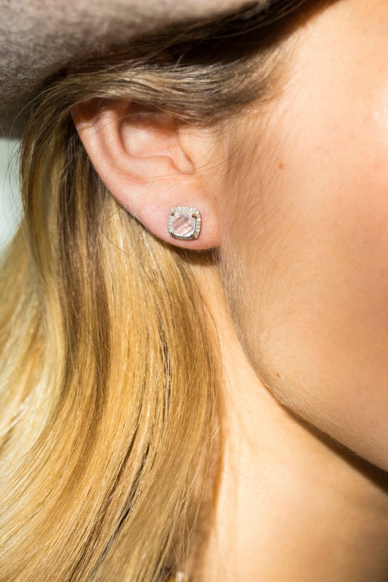 Puces en or rose serties de 28 diamants et d'un quartz rose.