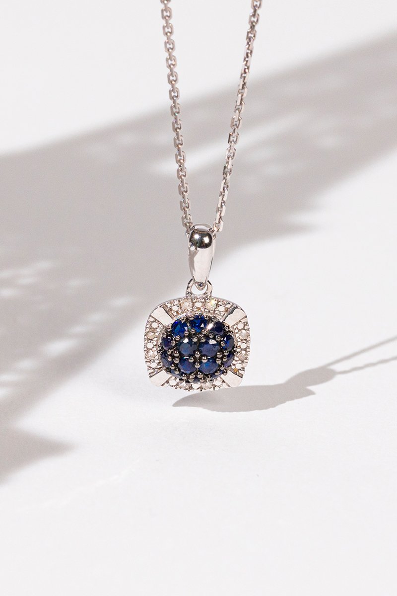 Pendentif en or blanc serti de 8 diamants et de 14 saphirs.