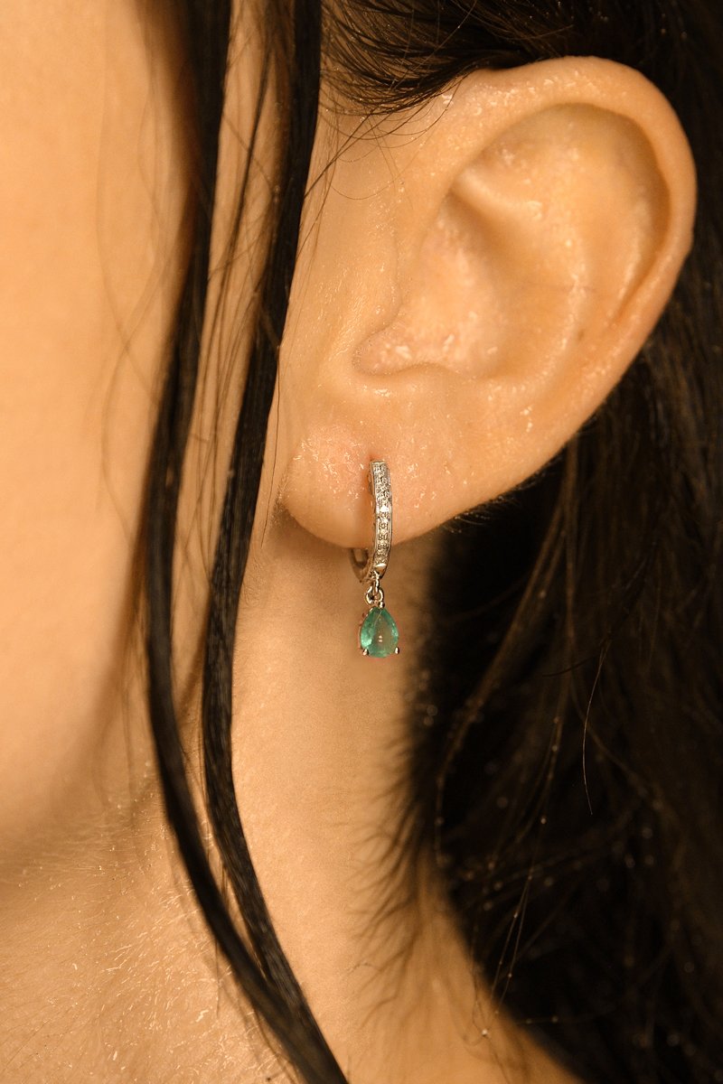 Créoles en or blanc serties de 10 diamants et d'une émeraude.