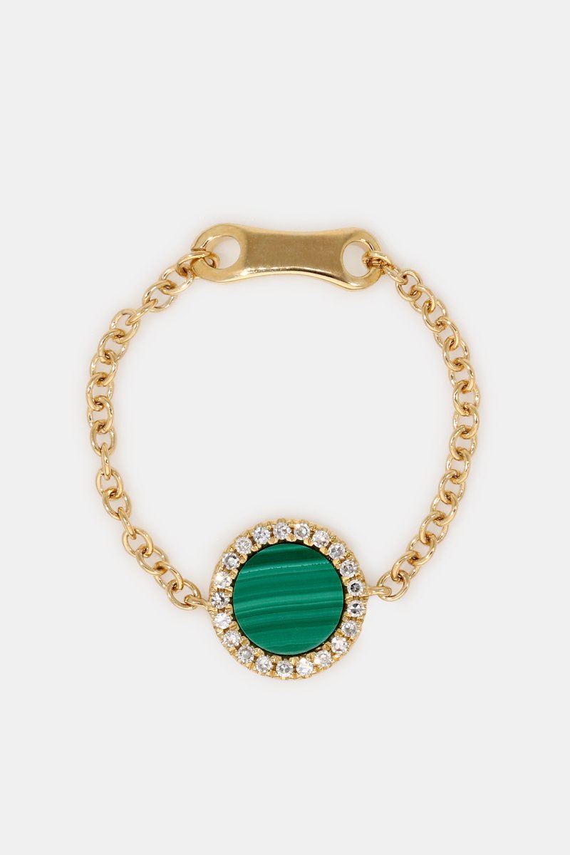 Bague chaîne en or jaune sertie de 21 diamants et d'une malachite.
