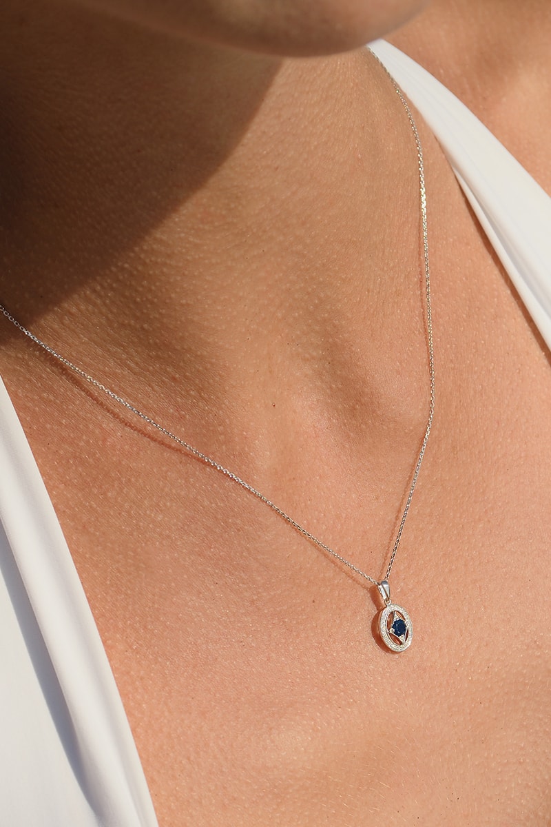 Pendentif en or blanc serti de 28 diamants et d’un saphir.