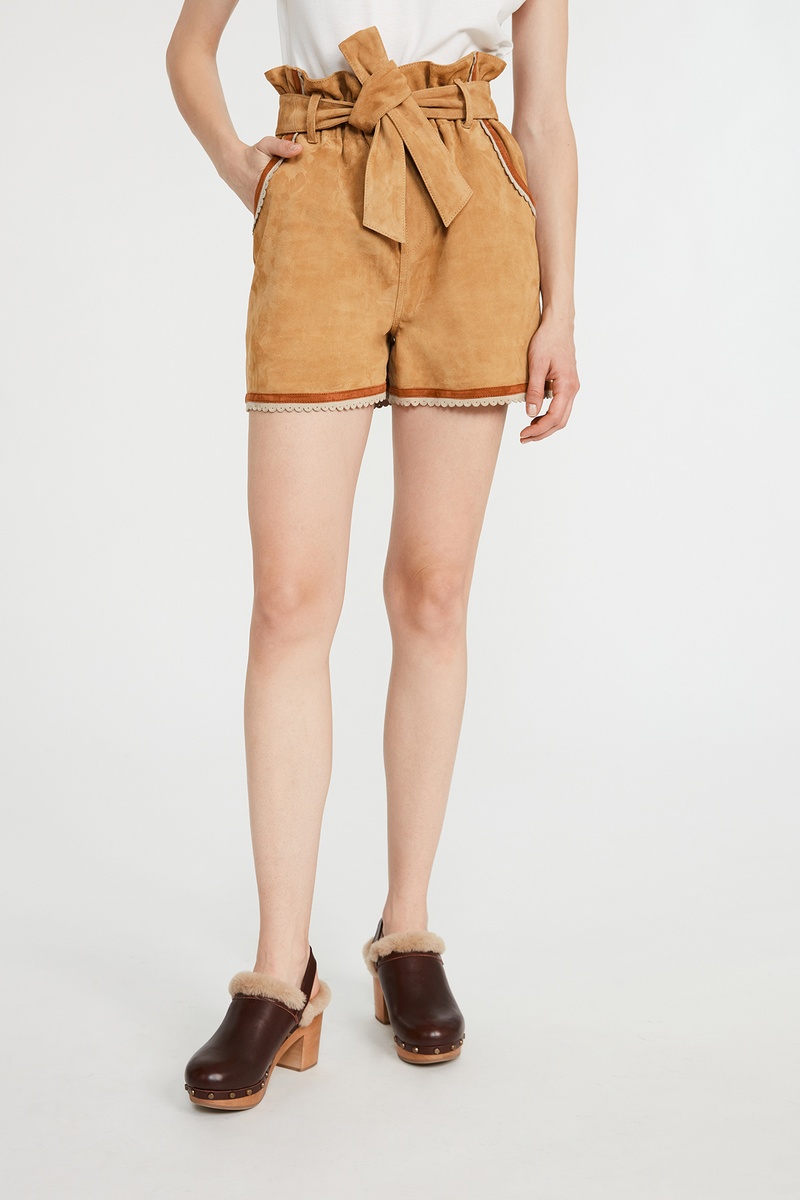 Short en cuir de chèvre nubuck taille haute - Marron clair - Claudie Pierlot