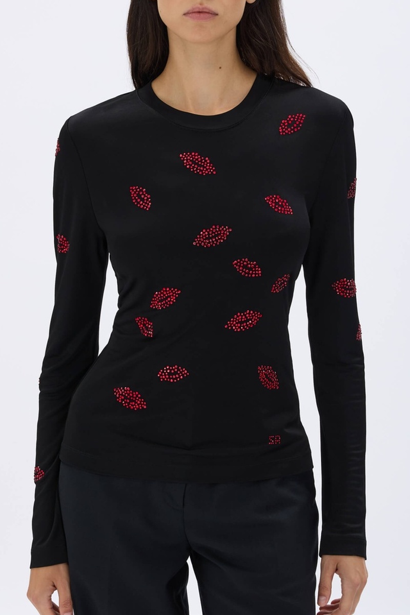 Motifs fantaisie à strass sur les manches, devant et au dos.