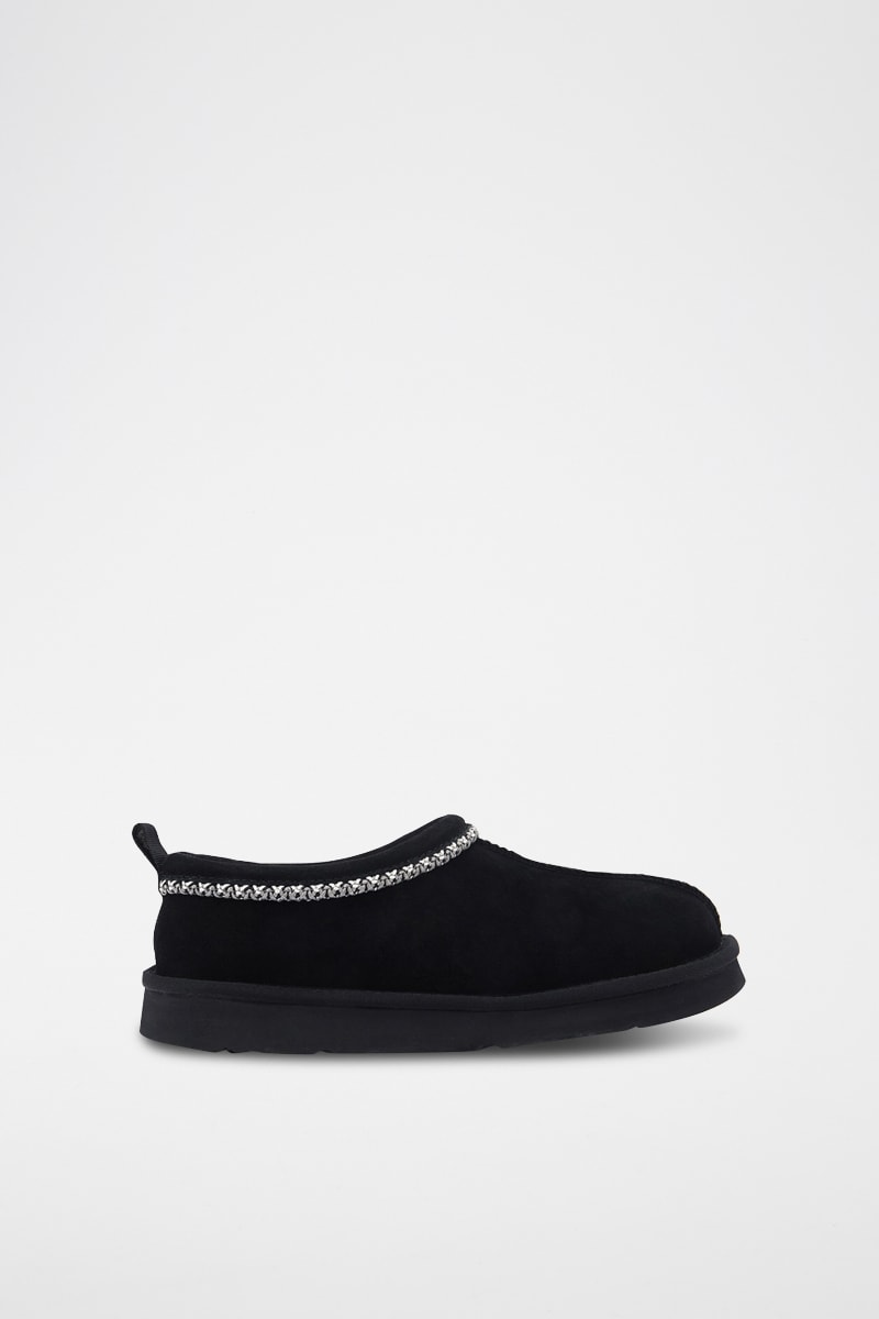 Pantoufles fourrées en cuir de mouton nubuck.
