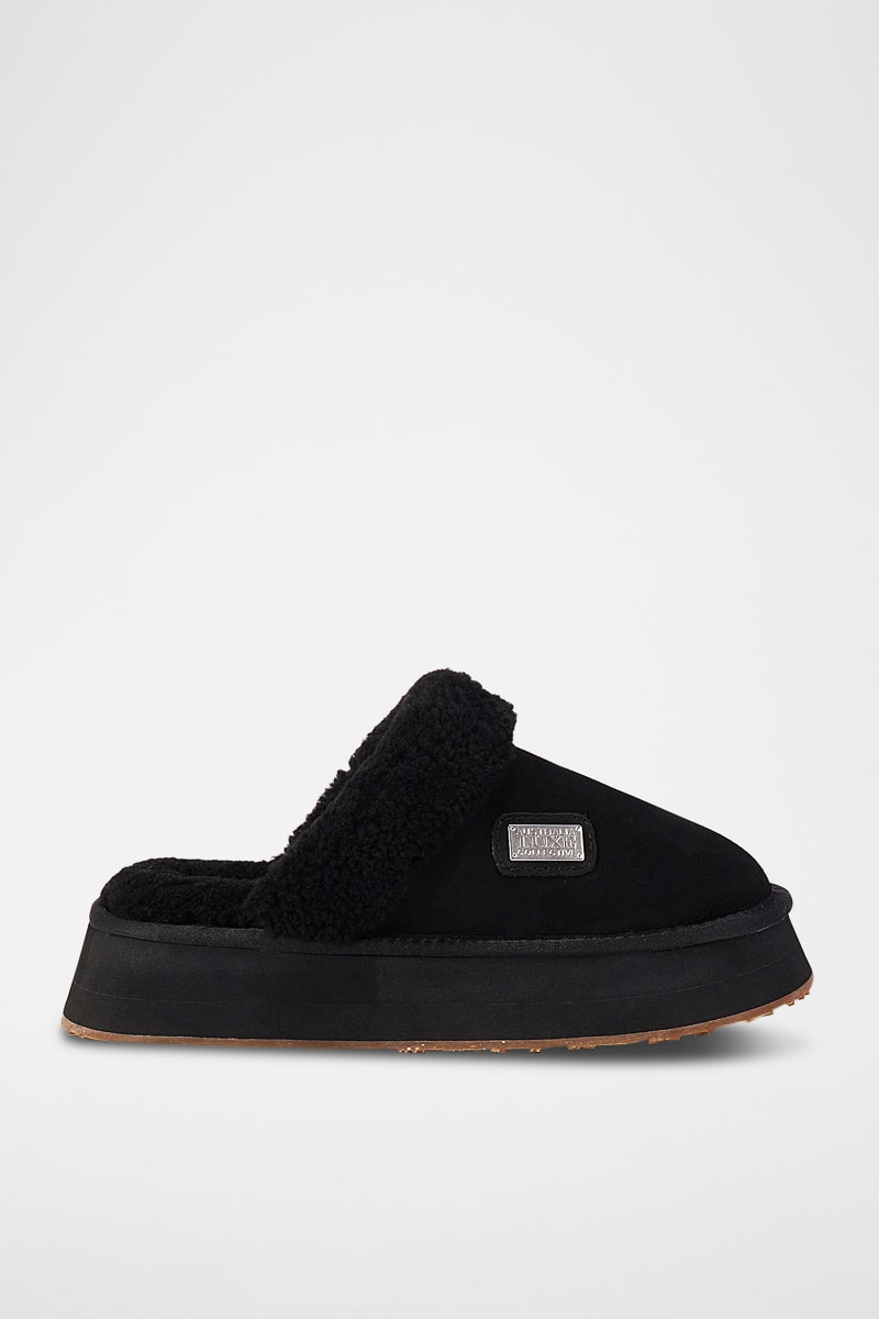 Pantoufles plateformes fourrées en cuir de mouton et nubuck.