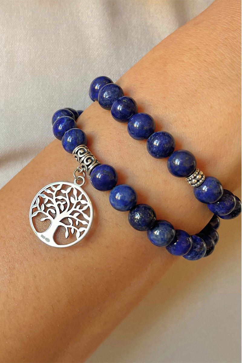 Bracelet élastique double tour en argent serti de lapis-lazuli.