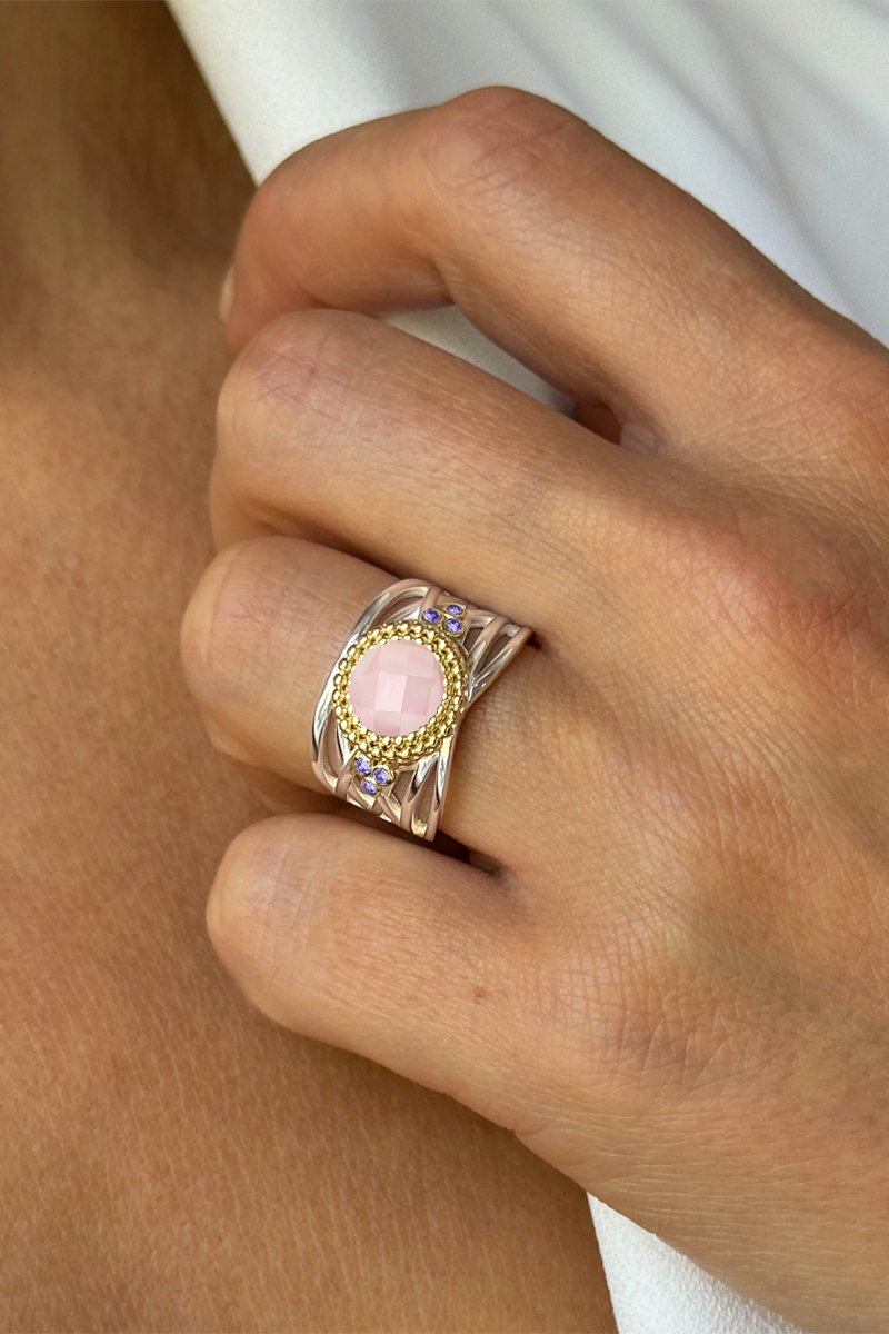 Bague - Argent, argent plaqué or jaune et quartz rose