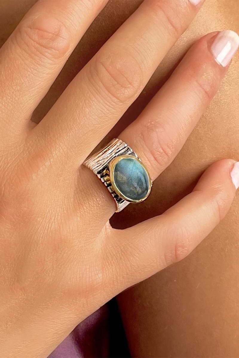 Bague en argent et argent plaqué or jaune sertie d'une labradorite.