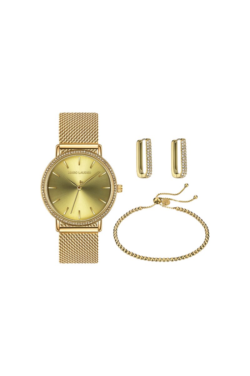 Coffret montre à quartz en acier et zircons, bracelet et boucles d'oreilles Marbella