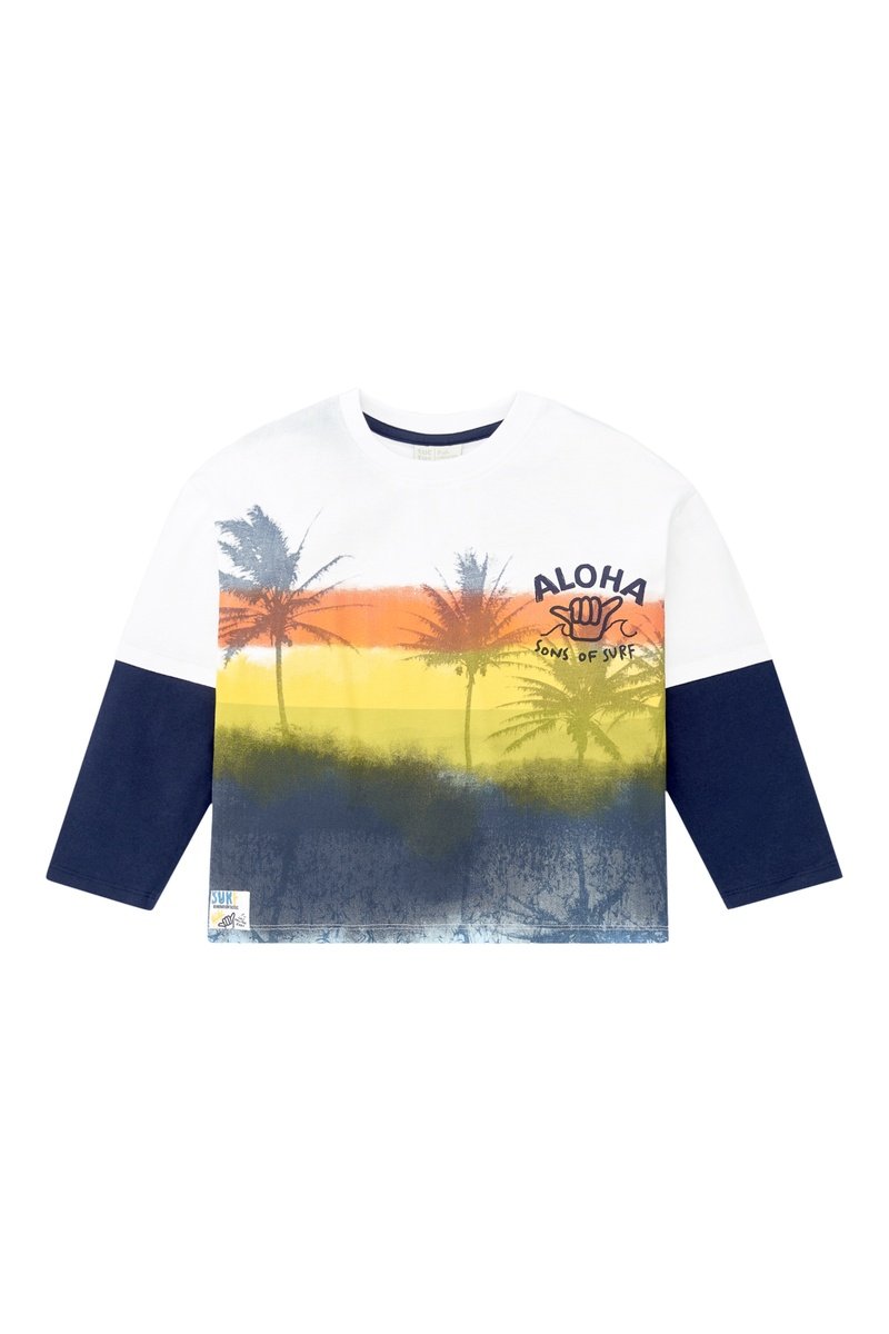 Lettrage, motifs fantaisie et empiècement avec logo devant.