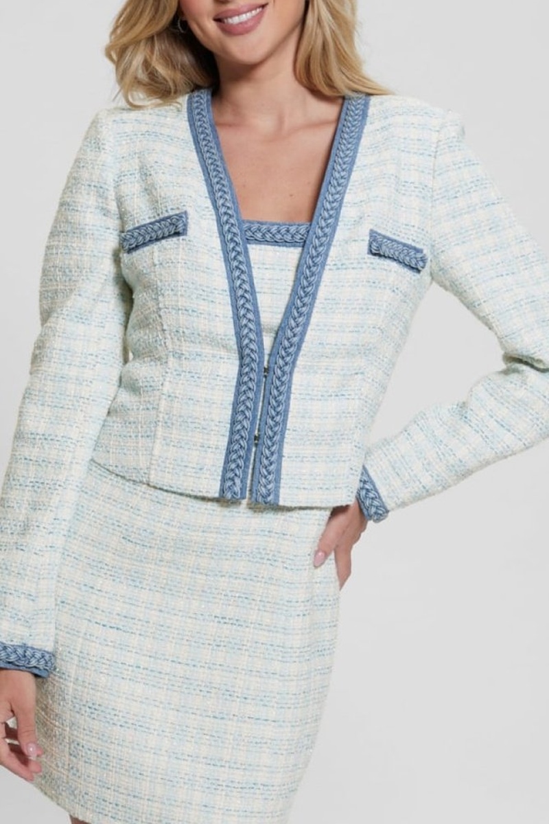 Empiècements effet tressé à l’encolure, sur les manches et devant.